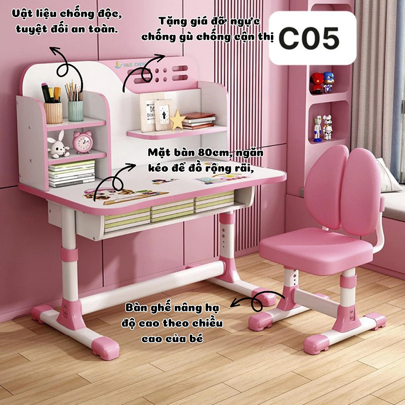 - Bảo vệ sức khỏe: Ghế ergonomics + chiều cao điều chỉnh giúp bé ngồi đúng tư thế, giảm nguy cơ cận thị và cong vẹo cột sống.