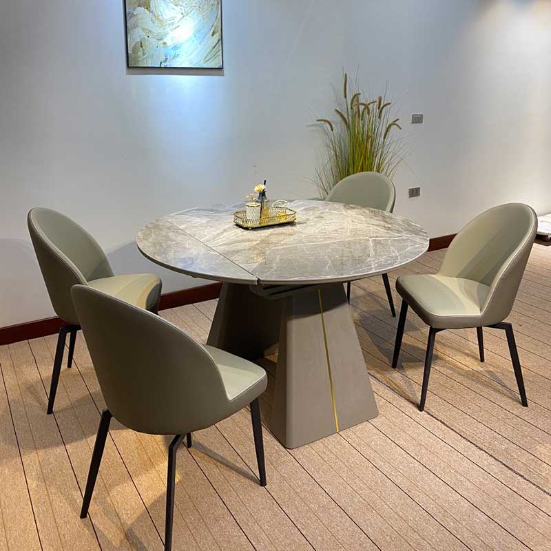 Bàn ăn được thiết kế khung thép sơn tĩnh điện. Mặt bàn thiết kế có thể thay đổi hình dạng từ tròn sang hình chữ nhật, mặt đá giúp mặt bàn sáng bóng tự nhiên. Khả năng chống thấm nước tốt.