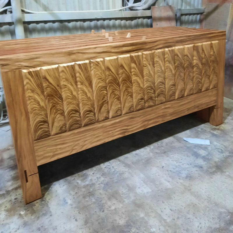 Đầu giường & đuôi giường gỗ làm kiểu dạng nan phủ sơn bóng mờ đẹp mắt. Đỉnh giường làm hơi cong tạo cảm giác êm ái khi tựa lưng. Phần khung giường làm dày, chân giường làm rộng tạo độ chắc chắn, làm điểm tựa tốt cho tổng thể sản phẩm.