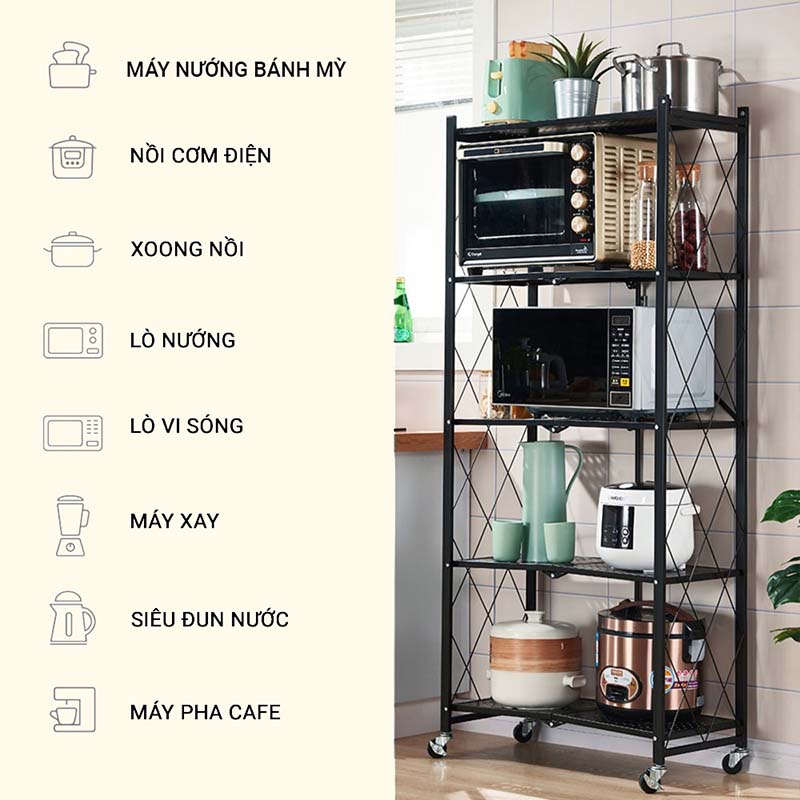 Kệ Sắt 4 Tầng Gấp Gọn Thông Minh Có Bánh Xe đẩy chịu tải trọng nặng, thích hợp sử dụng trong nhà bếp, nhà tắm hay phòng khách. Có thể để nồi cơm, lò vi sóng, bình đun nước, dụng cụ nhà tắm, làm tóc, dụng cụ gia đình, cây cảnh, quần áo ..v.v.. Giúp bạn dễ dàng cất gọn tiết kiệm không gian ngôi nhà bạn.